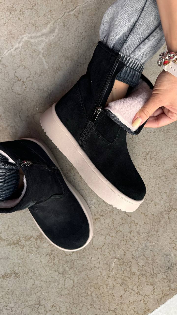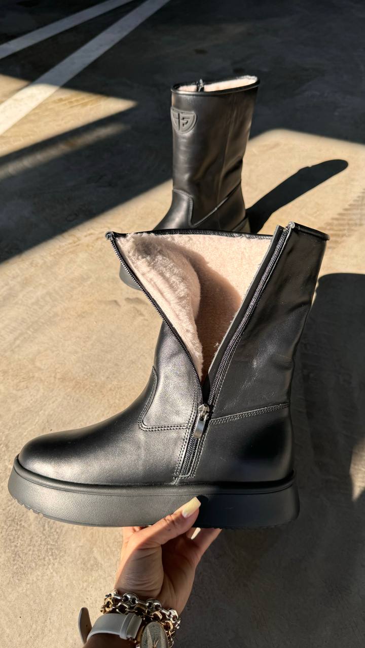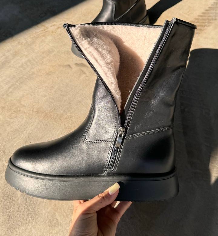 Хутряна підкладка добре зігріває та утримує тепло за мінусових температур. Верхній шар відштовхує вологу, зберігаючи сухість ніг під час опадів. Матеріал легко очищується від бруду, тому ви зможете зберігати взуття в чистоті. Завдяки боковій застібці-блискавці вам буде зручно знімати та взувати черевики.